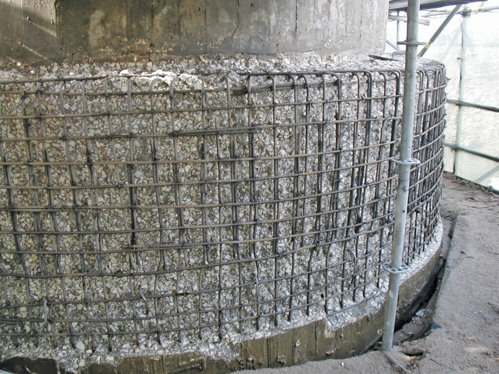 b) Reparação profunda localizada numa faixa de 4 m de altura, em toda a periferia do topo dos oito pegões – zona correspondente à variação de maré e troço permanentemente emerso, com evidências localizadas de corrosão das armaduras, pela técnica de substituição numa espessura de 8 cm do betão de recobrimento, por betão projetado estrutural aplicado por via seca com máquinas de câmara dupla.