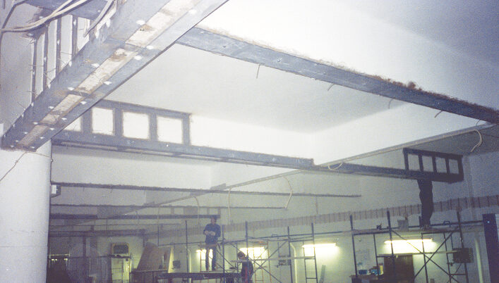 A intervenção no Edifício da Central de Correios de Lisboa dos CTT, em Cabo Ruivo, incidiu na execução de reforços metálicos de vigas e pilares e na reparação superficial de elementos estruturais danificados.