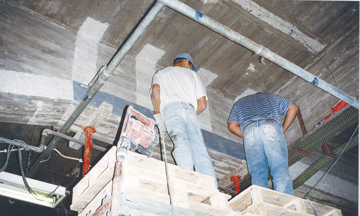 Após picagem do betão, para permitir uma conveniente aderência de resina de epóxido de colagem, procedeu-se à fixação dos perfis e chapas de reforço. Estes elementos foram previamente decapados a jato abrasivo, sendo as suas superfícies expostas protegidas contra a corrosão. A fixação ao betão foi feita por meio de buchas de aço e resina de epóxido aplicada por injeção.