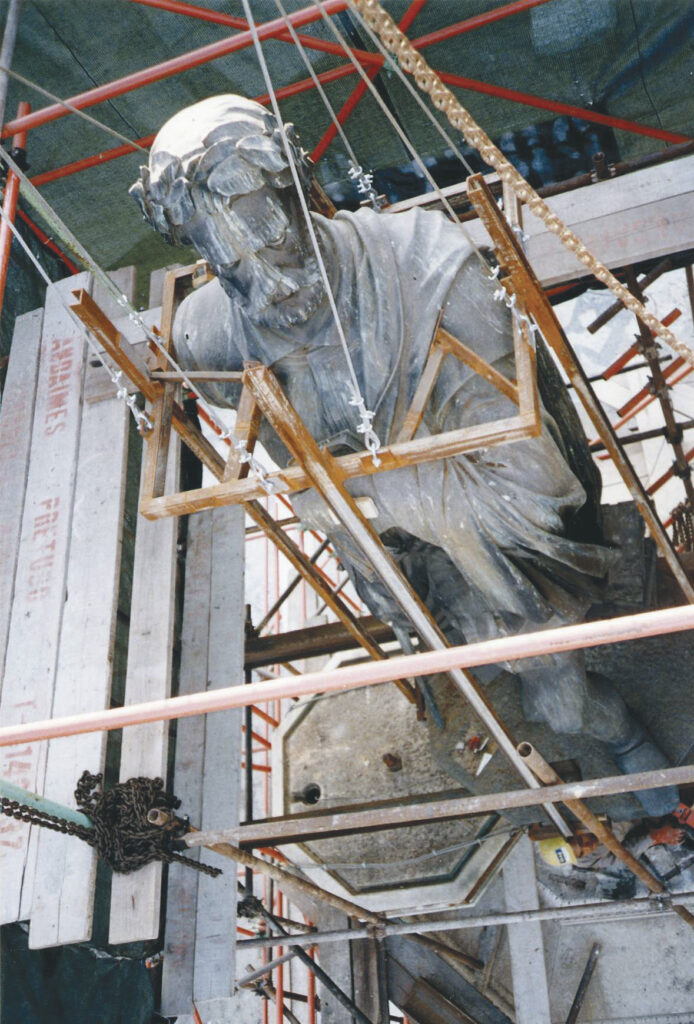 Após estas operações, a estátua de bronze foi novamente colocada. A intervenção foi concluída com a limpeza.
