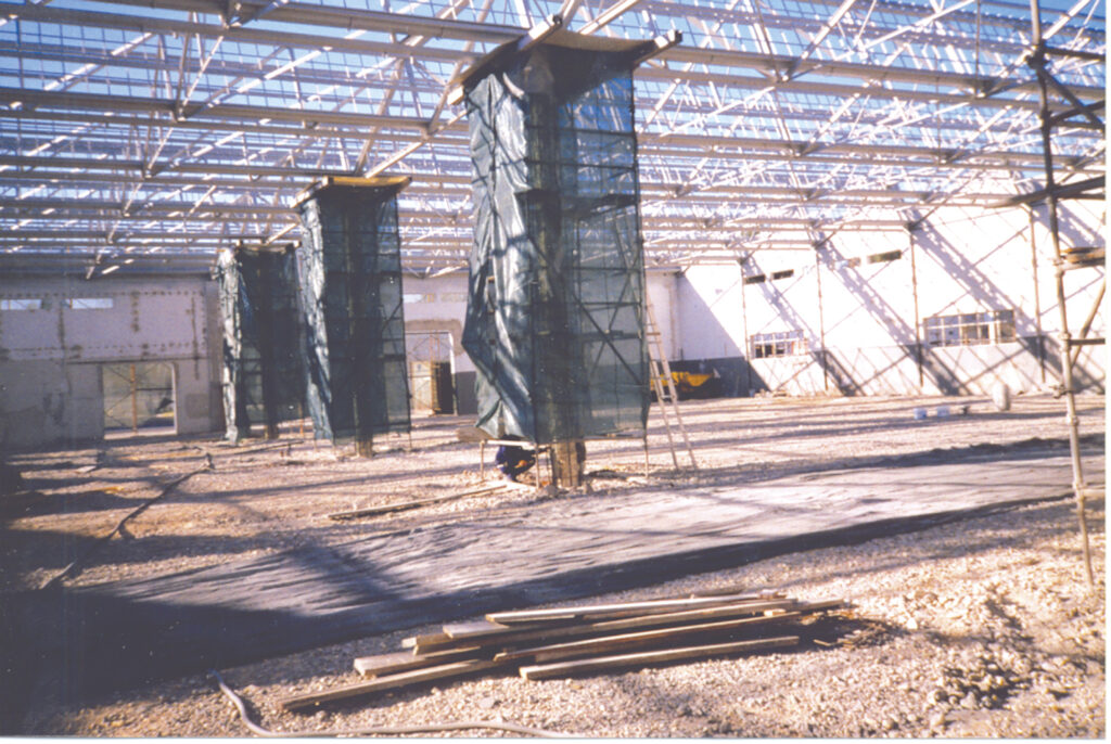 Em termos globais, procedeu-se à demolição de elementos existentes no interior dos armazéns, tais como divisórias de alvenaria, pilares, vigas e lajes, deixando unicamente os elementos absolutamente necessários ao funcionamento estrutural do edifício, elementos metálicos constituintes da cobertura e paredes exteriores.