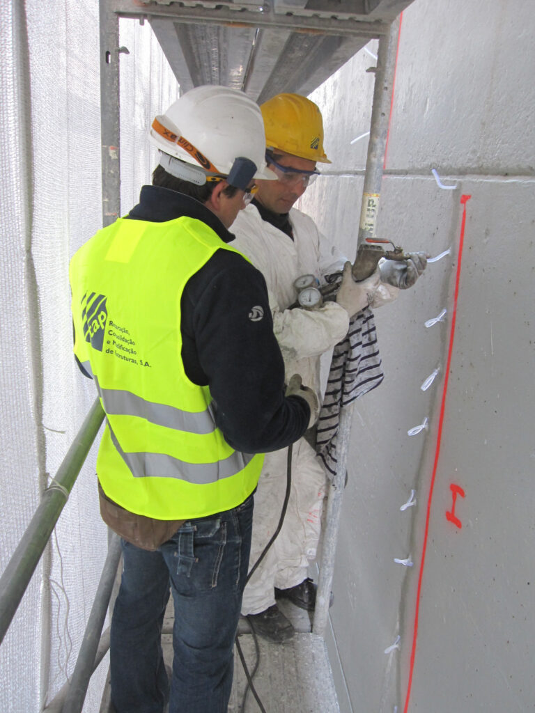 Os trabalhos de reabilitação do betão passaram pela reparação estrutural de betão armado, através de betão projetado por via seca, a selagem e injeção de resina de base epoxídica em fissuras estruturais e, por último, a aplicação de um revestimento protetor com elevado volume de sólidos, garantindo, deste modo, a longevidade da intervenção na estrutura.