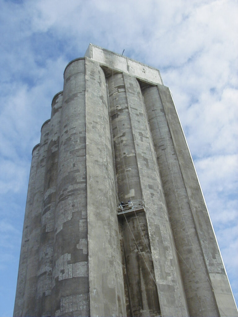 O silo, com uma estrutura em betão armado concluída em 1980 pelo método da cofragem deslizante, é constituído por uma torre de equipamento com 62 metros de altura e por uma bateria de 12 células cilíndricas, com diâmetro de 6,5 metros e altura de 50 metros. A estrutura, originalmente de betão à vista com uma superfície total exterior exposta de 6.000 m2, situa-se a cerca de 50 metros do mar, sujeita a uma exposição constante à névoa salina de um clima húmido e por vezes quente com ventos fortes.