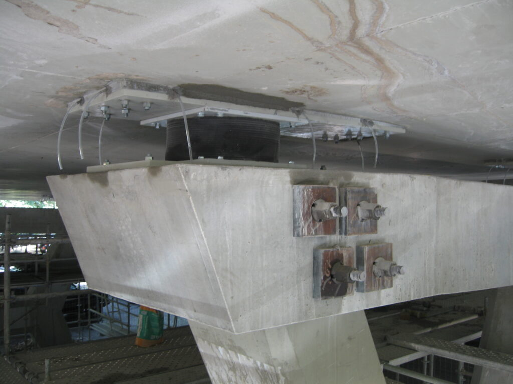 Para este efeito, a intervenção de reforço foi materializada pela introdução de aparelhos de apoio de elastómero cintado com núcleo de chumbo (LRB – Lead Rubber Bearings) e de aparelhos de borracha de alto amortecimento (HDRB – High Damping Rubber Bearings), entre o topo dos pilares e a viga em caixão e entre o topo das vigas do tabuleiro e os encontros.